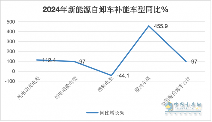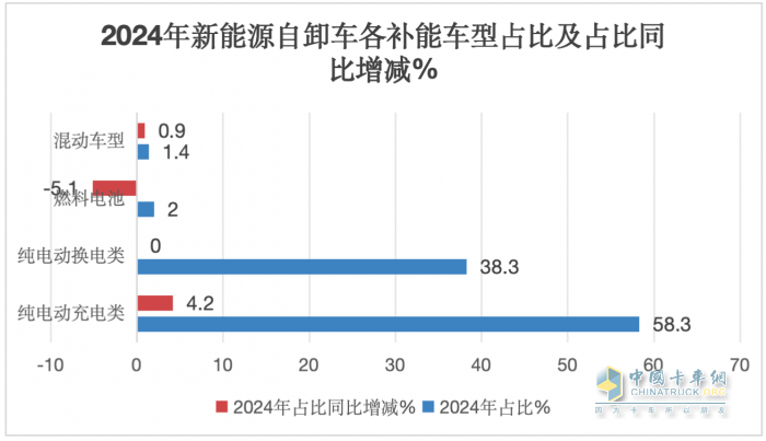 表2,根據(jù)終端上牌信息,按補(bǔ)能類(lèi)型劃分,2024年各類(lèi)新能源自卸車(chē)銷(xiāo)量、同比及占比、占比同比增減: