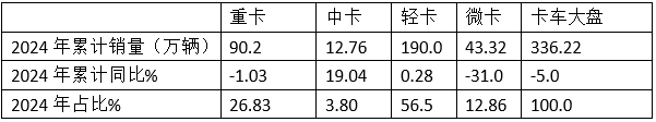 表1, 根據(jù)中汽協(xié)數(shù)據(jù),2024年輕卡(含皮卡和出口)同比與卡車各細(xì)分市場比較: