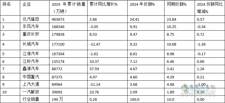 ---福田汽車?yán)塾?jì)銷售463763輛,是唯一累計(jì)銷量過40萬輛級(jí)別的車企,強(qiáng)勢奪冠,同比增長2.66%,跑贏2024年輕卡大盤,市場占比24.41%;占比同比增加0.57個(gè)百分點(diǎn),強(qiáng)者更強(qiáng);