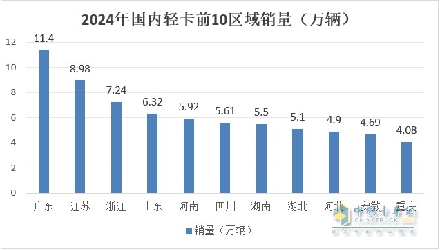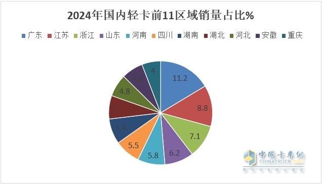 根據(jù)終端上牌信息,2024年國內(nèi)輕卡流向前11個(gè)區(qū)域市場銷量統(tǒng)計(jì)(只統(tǒng)計(jì)累計(jì)銷量超4萬輛的區(qū)域):