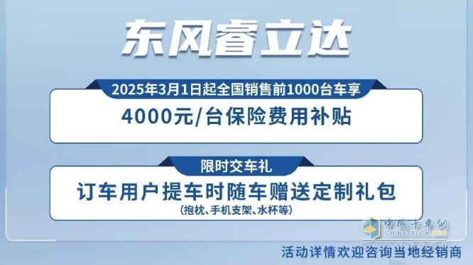 東風(fēng)睿立達系列自2025年3月1日起,全國銷售前1000臺車,可享4000元/臺的保險費用補貼!如此令人心動的鉅惠實屬難得,心動不如行動,想要奔向致富之路的伙伴們行動起來吧。