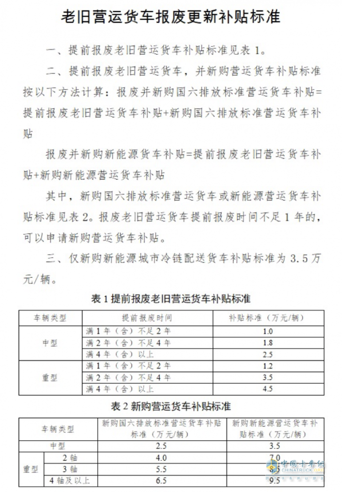 支持國(guó)三、國(guó)四排放標(biāo)準(zhǔn)營(yíng)運(yùn)貨車(chē)報(bào)廢更新,加快更新一批高標(biāo)準(zhǔn)低排放營(yíng)運(yùn)貨車(chē)。對(duì)提前報(bào)廢老舊營(yíng)運(yùn)貨車(chē)、提前報(bào)廢并更新購(gòu)置國(guó)六排放標(biāo)準(zhǔn)貨車(chē)或新能源貨車(chē)、僅新購(gòu)符合條件的新能源貨車(chē),按照?qǐng)?bào)廢車(chē)輛類(lèi)型、提前報(bào)廢時(shí)間和新購(gòu)置車(chē)輛動(dòng)力類(lèi)型等,實(shí)施差別化補(bǔ)貼標(biāo)準(zhǔn)(見(jiàn)附件1)。 上述補(bǔ)貼政策實(shí)施期限為2025年1月1日至2025年12月31日(報(bào)廢貨車(chē)《報(bào)廢機(jī)動(dòng)車(chē)回收證明》《機(jī)動(dòng)車(chē)注銷(xiāo)證明》日期、新購(gòu)置貨車(chē)《機(jī)動(dòng)車(chē)行駛證》注冊(cè)登記日期和《道路運(yùn)輸證》發(fā)放日期均應(yīng)在政策實(shí)施期內(nèi))