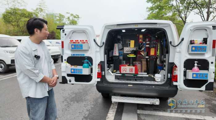 在爭分奪秒的救援中,能否一次帶齊所有關(guān)鍵設(shè)備,往往決定了成敗。江豚E5那5.3m³的方正大貨廂和1230mm的輪包間距,成為改裝工程師眼中的“完美畫布”。張偉指著車箱內(nèi)部對記者介紹說:“救援車要裝千斤頂、大功率發(fā)電機(jī)、各種尺寸備胎、甚至小型吊裝設(shè)備。江豚E5的對開式超大尾門和1米寬側(cè)滑門,讓叉車能直接把滿載的托盤塞進(jìn)去,裝車效率提升40%以上。同樣的車長,江豚能多裝20%,這意味著我們一次出動,解決問題的概率大大增加。在救援現(xiàn)場,多一件關(guān)鍵設(shè)備,可能就是天壤之別。”