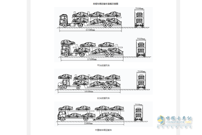 即:平頭鉸接列車裝載6輛及以下,限長17.1米;長頭鉸接列車裝載7輛及以下,限長18.1米;中置軸車輛運(yùn)輸車裝載8輛及以下,限長22米,以及均限寬2.55米,且裝載長度、寬度未超過車輛運(yùn)輸車外廓尺寸限值。