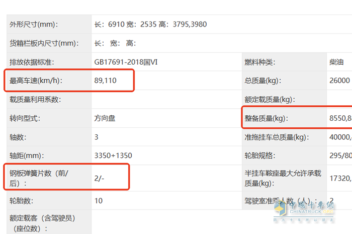 底盤細節(jié)方面,新車將適配有前2片鋼板后氣囊懸架,且最高車速也根據(jù)國內(nèi)法規(guī),有了89km/h和110km/h的限速匹配,同時整車自重有著8550kg、8870kg、9100kg三種選擇。