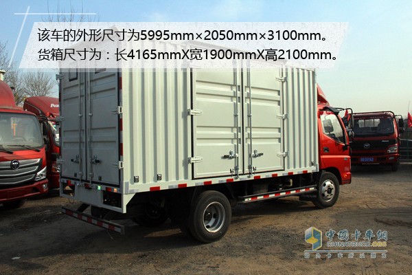 該車的外形尺寸為5995mm×2050mm×3100mm。作為一款廂式貨車它的可裝貨箱尺寸為:長4165mmX寬1900mmX高2100mm。