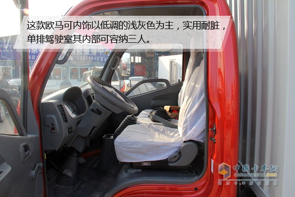 單排窄體駕駛(1800mm)室采用了紅色涂裝,擋風(fēng)玻璃上貼有城市貨運(yùn)專家的字樣。