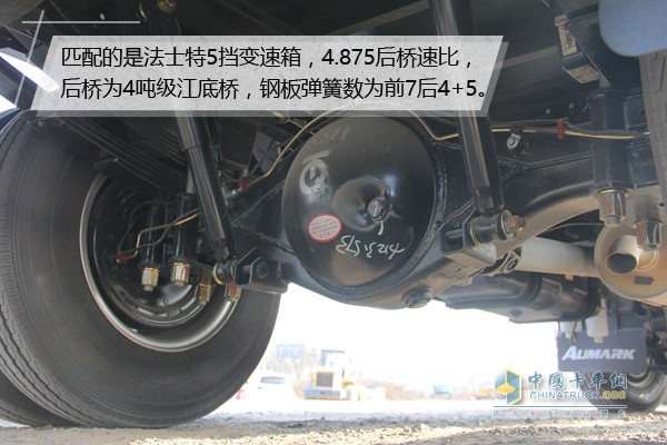匹配的是法士特5擋變速箱,4.875后橋速比,換擋流暢,質(zhì)量更穩(wěn)定可靠。后橋噸級為4噸級,鋼板彈簧數(shù)為前7后4+5,擁有良好的承載能力。