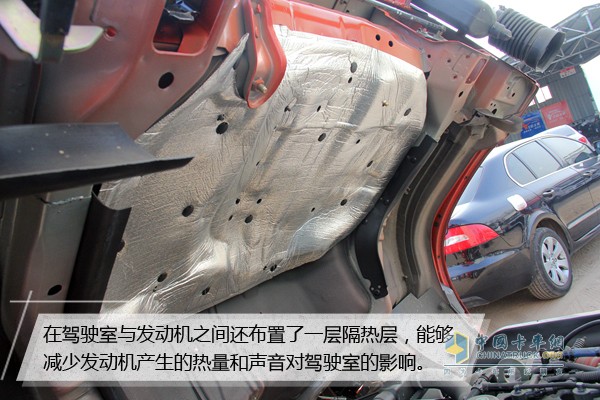 在駕駛室與發(fā)動機(jī)之間還布置了一層隔熱層,能夠減少發(fā)動機(jī)產(chǎn)生的熱量和聲音對駕駛室的產(chǎn)生影響,尤其是在夏季,能夠減少空調(diào)冷氣的消耗。