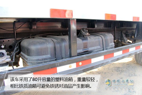 該車采用了80升容量的塑料油箱,重量較輕,相比鐵質(zhì)油箱可避免鐵銹對油品產(chǎn)生影響。