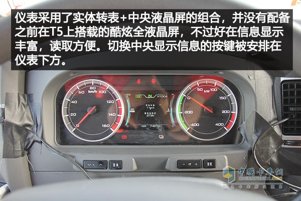 來到車內,雖然車內遍布各種儀器的走線,但還是不難發(fā)現(xiàn)比亞迪T5純電動城市物流車的按鍵選檔,這也是比亞迪商用車多用的設計,簡單、好用,就夠了。