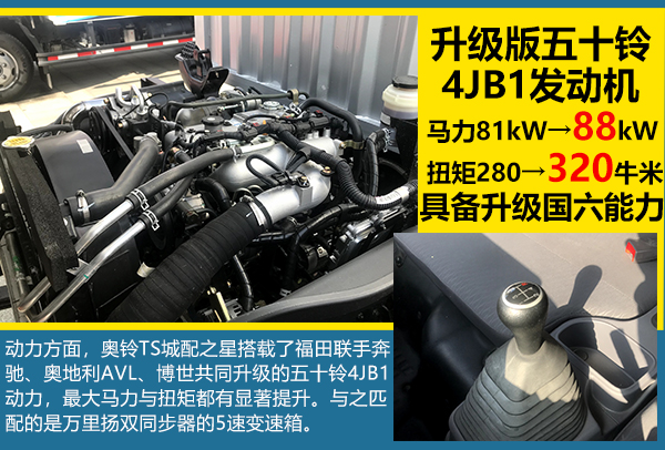動力方面是奧鈴TS城配之星的亮點之一。對,它還是搭載五十鈴4JB1發(fā)動機(jī),但是,是福田聯(lián)手奔馳、AVL、博世升級開發(fā)的進(jìn)化版本,集眾家發(fā)動機(jī)大咖所長,不僅功率提高,還讓它直接拿到了升級國六的資格證。