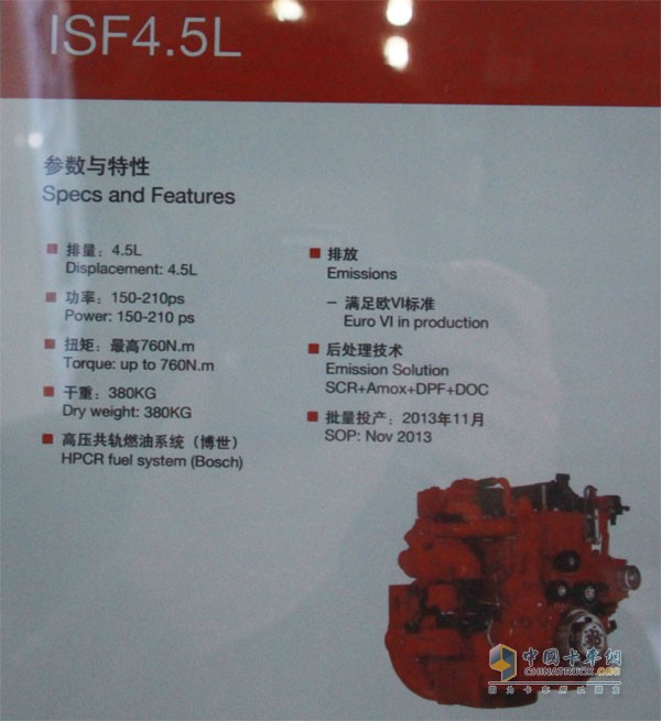 功率覆蓋150-210馬力,最大扭矩可達(dá)760N?m,其動(dòng)力性和經(jīng)濟(jì)性與國內(nèi)同馬力段競品相比均具有很大的優(yōu)勢。最重要的是ISF4 5L是一款完全滿足歐六標(biāo)準(zhǔn)的發(fā)動(dòng)機(jī),其后處理系統(tǒng)采用DOC+DPF+SCR的集成系統(tǒng),可將顆粒物及氮氧化物同時(shí)進(jìn)行有效處理,進(jìn)而達(dá)到歐六的排放標(biāo)準(zhǔn),據(jù)了解該發(fā)動(dòng)機(jī)在2013年7月就已經(jīng)批量投產(chǎn),并熱銷海外,可以說是一款集創(chuàng)新與科技于一身的一款世界級的發(fā)動(dòng)機(jī)。