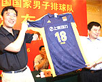 中國國家男排主教練周建安先生向上柴股份有限公司副總經(jīng)理楊建軍先生贈送男排全體簽名球衣