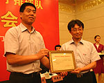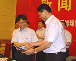 | 國家體育總局排球運動管理中心主任,中國排球協(xié)會副主席徐利向上柴股份有限公司副總經(jīng)理任國進(jìn)授予上柴公司贊助商稱號獎牌 |
