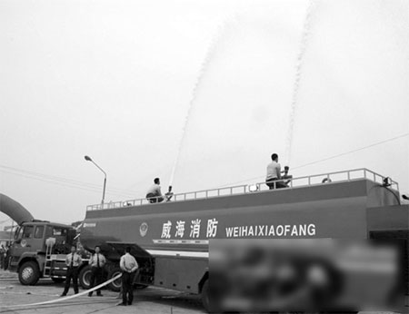 近日上午,山東省第一輛大型消防車——50噸火場供水照明車在威海正式交付使用。