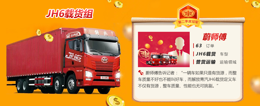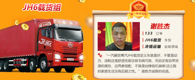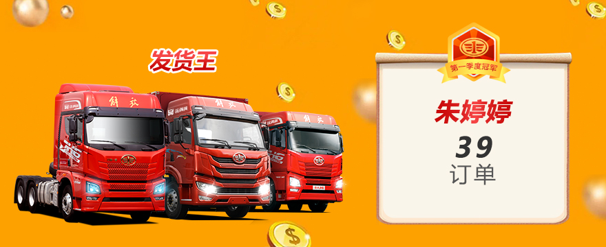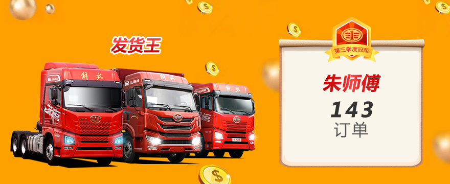 2020年4月1日,一汽解放青汽、運(yùn)滿滿&貨車幫聯(lián)合舉辦,開啟了定義車接單王、發(fā)貨王評(píng)選活動(dòng)第一賽季。截止到2020年6月7日,來自河南濮陽(yáng)的謝勝杰,以108單的訂單量成為一汽解放青汽JH6載貨定義車組冠軍,遠(yuǎn)超亞軍41單,更是季軍訂單數(shù)量的兩倍,可謂是當(dāng)之無愧的王者。【查看詳情】
