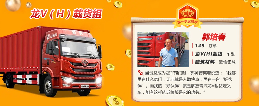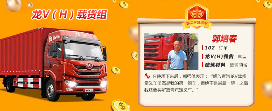一汽解放青汽、運(yùn)滿滿&貨車幫聯(lián)合舉辦的定義車接單王、發(fā)貨王評(píng)選活動(dòng)第一賽季,從2020年4月1日開啟到現(xiàn)在也有一個(gè)月的時(shí)間了,解放青汽龍V載貨定義車?yán)纤緳C(jī)用戶郭培春,以月57單的成交量,榮登龍V(H)載貨車組月冠軍。【查看詳情】
