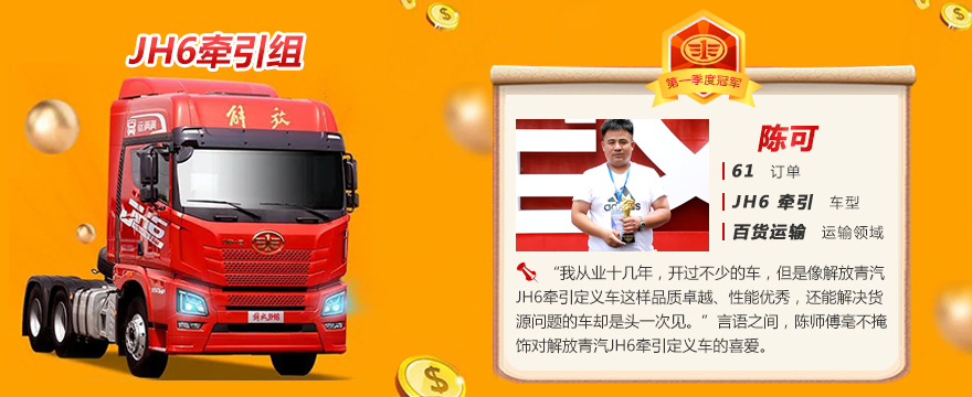 2020年4月1日,一汽解放青汽、運(yùn)滿滿&貨車幫聯(lián)合舉辦,開啟了定義車接單王、發(fā)貨王評(píng)選活動(dòng)第一賽季。截止到2020年4月27日,來自河南濮陽(yáng)的陳海印,以37單的訂單量成為解放青汽JH6載貨定義車組冠軍。【查看詳情】