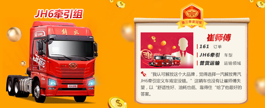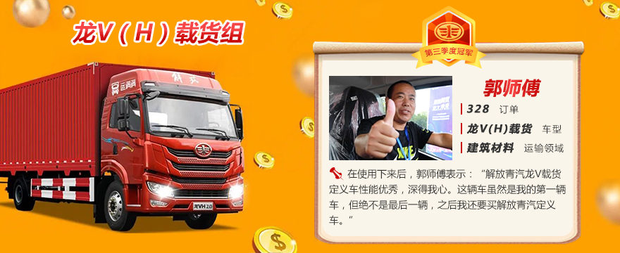2020年11月30日,一汽解放青汽雙王評(píng)選圓滿收官,接單王、發(fā)貨王榮耀登場(chǎng)!接單王和發(fā)貨王名單出爐!其中,崔師傅以161單成為JH6牽引車組冠軍,劉師傅以242單成為JH6載貨車組冠軍,郭師傅以328單成為龍V(H)組冠軍。【查看詳情】
